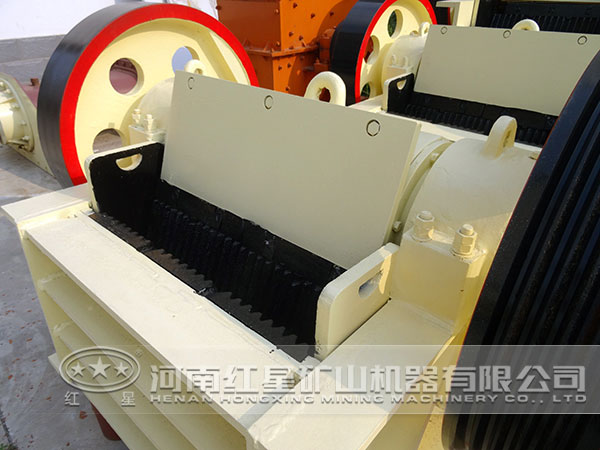 明矾石破碎机内部结构简单,主要由飞轮、动颚、侧护板、机架、偏心轴、肘板后座、调隙螺杆、大皮带轮、肘板、复位弹簧、固定颚板、活动颚板等几部分组成。