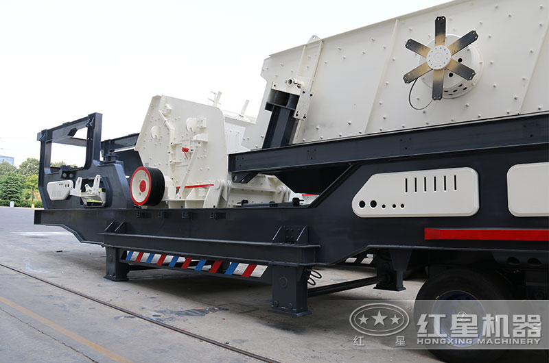 上面这台车就是移动锤式破碎站,也叫移动式破碎机。我们看图片可以看到,这台车类似于一个拖车,有轮胎式的底盘。上面安装有一些设备,这还没有组装完工。上面安装有振动给料机,重锤式破碎机,输送机,电动机,这台破碎机核心设备是给料机,破碎机,所以也叫二合一移动破碎车。