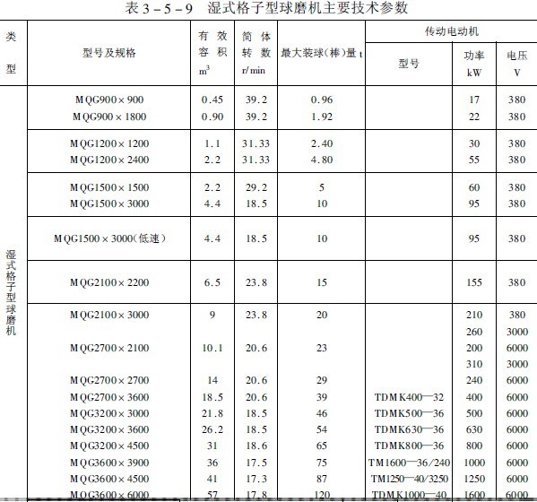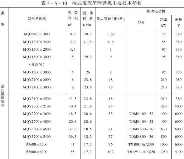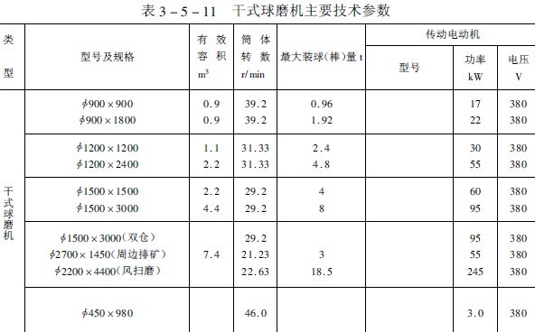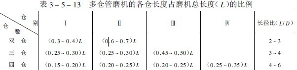 管磨机用于开流(路)系统时,选取较大的长径比,一般L=(3.5-6.0)D;用作闭流(路)系统时,选用较小的长径比,一般L=(3.5-6.0)D。多仓管磨机各仓(室)的长度按实际情况确定。但在许多情况下,磨机后的一个仓室(细磨仓)的长度长,各仓(室)占筒体有效长度的百分数,如表3-5-13所示。