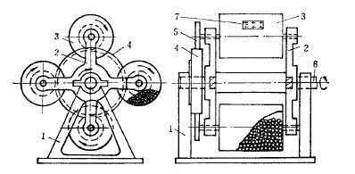 图3示出了回转磨机的结构及工作原理。当转动轴6旋转时,筒体1除在水平方面旋转外还围绕2在垂直方向旋转,这样促使研磨介质作非常复杂的运动。筒体在垂直方向和水平方向适宜的速比为1:1-1:1.5。