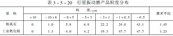 转动形成了筒绕Ⅰ号轴的公转;Ⅱ号轮带动Ⅵ号轮形成磨筒绕其自身轴的自转。这种磨机兼有行星磨和振动磨二者的特点,具有高频冲击和磨剥的双重作用,故磨碎作用强,是一种有效的超细磨碎设备。表3-5-20示出了用该磨机磨碎锆英石和工业氧化铝的产品粒度分布。