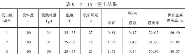 由于尾砂粒度细、难渗滤,故采用浸出池进行生产,先加酸化水中和矿石中的碱性脉石,待溶液pH值达2.0左右时,加入含菌高铁(Fe2+)的浸矿剂或浸出贫液(指含铜和稀有金属降低,Fe2+较高的浸出液)进行循环浸出,直到浸出液铜、稀有金属较低为止。然后,加铜稀有金属含量极低的细菌高铁液,当浸出液浓度更低时,再用水洗两三天排料。尾砂浸出时间为二十天,浸出结果列于表9-2-15。