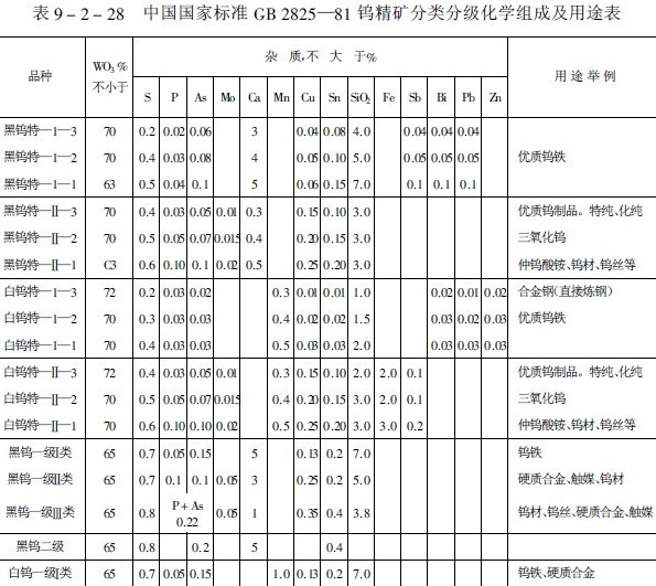 上述情况表明,冶炼对钨精矿的质量要求是非常高的。但国际上并无统一标准,通常是冶炼厂根据自己所具备的工艺条件,来选购所需的钨精矿。现将我国及世界有关国家所拟定的钨精矿质量标准,分别列表于后。表9-2-28为我国钨精矿质量标准,同时还规定可根据用户需要和资源特点,自订企业标准,这可使生产单位和使用单位在执行标准时有灵活性。