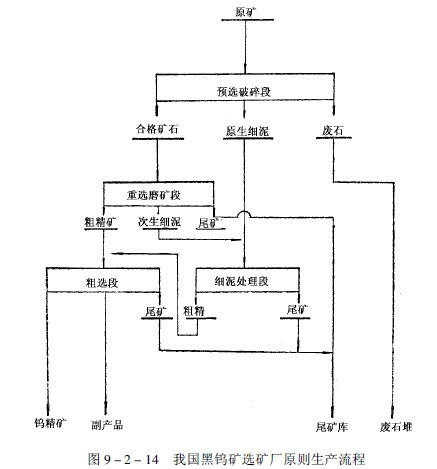 综上所述,我国黑钨矿选矿的原则流程是,原矿粗碎后分级预先富集,抛弃大量粗块废石;合格矿破碎筛分,经三级跳汰,加强粗粒早收;跳汰尾矿磨矿分级,实行多级摇床分选,丢弃尾矿,中矿再磨再选:细泥集中浓缩,单独处理;重选粗精旷采用多种方法联合精选,既提高钨精矿品位,又综合回收副产。图9-2-14为我国黑钨选矿原则生产流程。