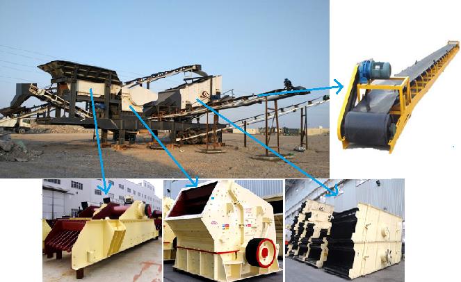 3、破碎机:在这里,破碎机可单机作战,也可多机组合。常见的破碎机有鄂式破碎机、反击式破碎机、锤式破碎机、圆锥破碎机等等,他们的主要作用是就是将分拣好的大块石料破碎成小的砂石成品。