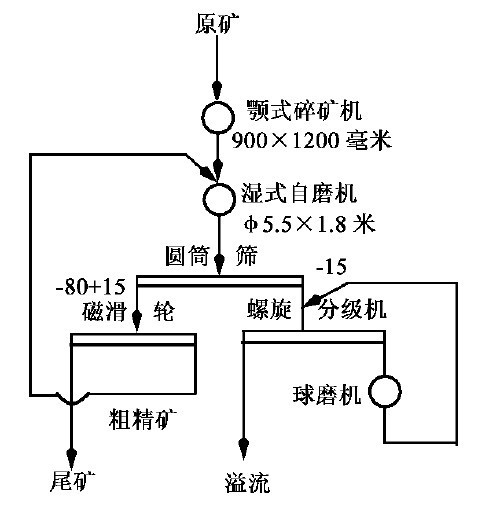 当要求磨矿产物细度为-200 目占70%以上时,应采用两段自磨流程。两段自磨时,第一段自磨机可在闭路条件下工作,也可开路工作。第二段磨矿可采用球磨,亦可采用砾磨,但两者一般都在闭路条件下工作。例:某磁铁矿两段半自磨流程,如图1所示。该铁矿是我国目前采用湿式自磨工艺的选矿厂。矿石比重为3.4 吨/米3 ,矿石普氏系数f=12-16,岩石普氏系数f=10,矿岩松散系数为1.5 左右。要求磨矿细度为85%-200 目。