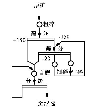 为自磨磨矿介质,然后按一定比例给入自磨机。自磨介质一般占原矿的15%-30%左右,视矿石性质而定。粗碎后筛出的筛下产物约占原矿的70-85%进行中细碎,使其破碎到-20毫米,即相当于一般球磨机的给矿粒度,然后给入自磨机进行磨碎。这样,自磨机的给矿粒度及介质粒度的大小和数量都能得到控制。