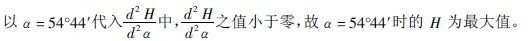 在抛落式工作的磨机中,磨矿作用主要来自钢球到达落回点的动能。此动能的大小,与钢球的落下高度(H)有关,而钢球的落下高度又决定于磨机的转速。根据前面的论述,必然可从钢球落下高度来决定磨机的合适转速。照此理,将公式取导数,并令它等于零,就可以求出使钢球有抛物落下高度时的脱离角,再从它找到相应的转速。