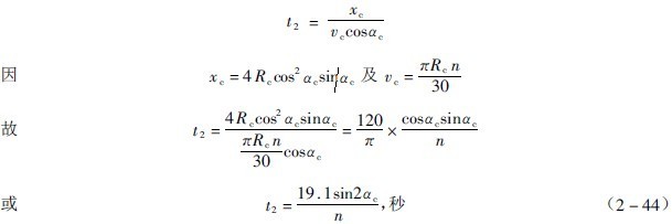 磨机一直是作圆运动的,但其中的钢球的运动轨迹,一部分是圆曲线,另一部分是抛 物线。因此,磨机转一转,钢球的运动未必也就是一个循环。钢球从脱离点A真抛到落回点B,比圆运动快,因而钢球总是超前的,换句话说,磨机转一转时,钢球不只循环运动一次。设%"是钢球作圆运动的时间,当磨机转一转时,用同样速度作圆运动的钢球转过的圆心角为