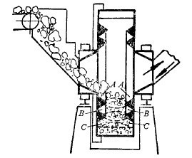 伟斯顿对干式自磨过程的理论进行了较长时间的研究。他对干式自磨机中矿石粉碎过程的运动情况作了如下的描述。