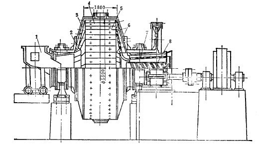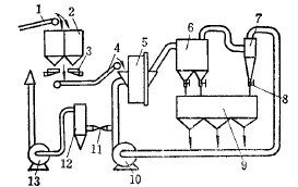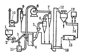 细小的物料继续进入旋风分离器7,进行第二次分级,这时绝大部分细小物料都沉降。已在沉降箱和旋风分离器中沉降的物料靠锁气器8间断排出,贮存在粉矿仓9中,以便进行干式磁选。未被收集的微细物料在闭路风路系统中循环。闭路系统中主风机出口到磨机入口段,其静压值有部分为正压,粉尘易从这一段逸出。为使主风路系统在负压条件下工作,防止灰尘溢入室内漫延,减少微细物料和水分在主风路系统中造成恶性循环,设有副风路系统。副风路系统设在主风机与自磨机之间,由文氏管11洗涤器12及辅风机13组成。经副凤路系统净化后的气流排于大气中。