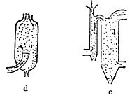 图3-4-5示出几种简单的有代表性的重力风力分级器。图3-4-5a所示的分级箱,原料从上部给料斗中给入,在水平气流作用下,粗粒落下的地点近,细粒落下远,不能落下的微细粒被气流带走。分段截取,可得多个不同粒级产物。这种分级箱用于处理较粗的物料。图3-4-5所示的分级器,颗粒随气流一起进入分级器,由于过流断面突然增大和挡板的阻滞作用,气流速度减慢,粗粒在重力和惯性力作用下沉落,细粒被气流带走。图3-4-5a和e表示的是在上升气流中进行的分级器。前者得两种产物;后面一种,物料从上,气流从下部供入,可得三产物。