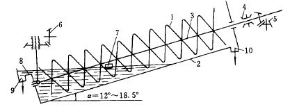 螺旋分级机的结构如图1所示。分级槽2呈倾斜安置,倾角一般为12。-18.5。,槽的底部为半圆形。矿浆从槽的中间部位进料口7给入,在分级槽下端的分级带完成分级。细粒级经槽子下端溢流堰8随水流从溢流排出口9排走。粗粒级产物在分级带沉降,然后由螺旋1将其运到槽子上端的沉砂排出口10排出机外。螺旋安装在中空主轴3上,主轴两端由轴承4支承,轴的上端设有传动装置5,轴的下端置于提升机构之内,必要时可调节螺旋在槽内的高度。